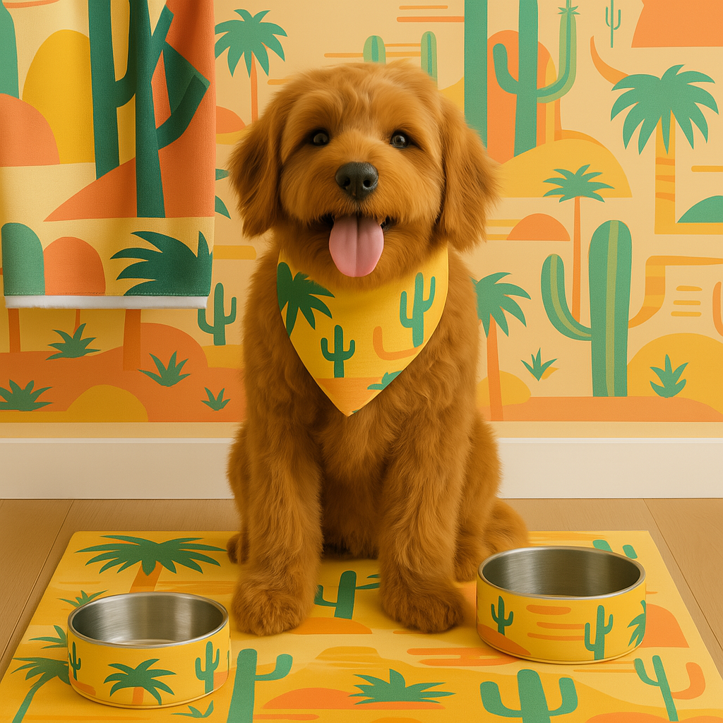 The Palm Springs Collector’s Set is a curated escape for pets who dine with flair and chill in style. With two art-inspired bowls, a sleek mat, a crisp towel, and a breezy bandana, this set transforms everyday care into timeless mid-century cool.